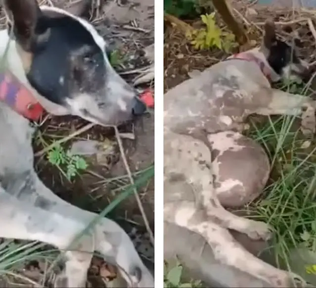 When the rescue team arrived, the sight before them was devastating. The poor dog lay motionless, her fragile frame stretched across the ground. Her belly was swollen in an unnatural way, leading the rescuers to fear the worst.
