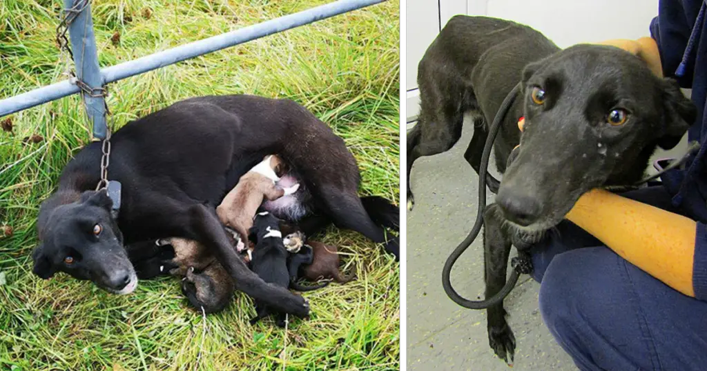 Her thin body was tightly chained to a cold metal fence post, her freedom stripped away. Just a few feet from her, six tiny newborn puppies—so small their eyes had not yet opened—lay helpless on the ground.