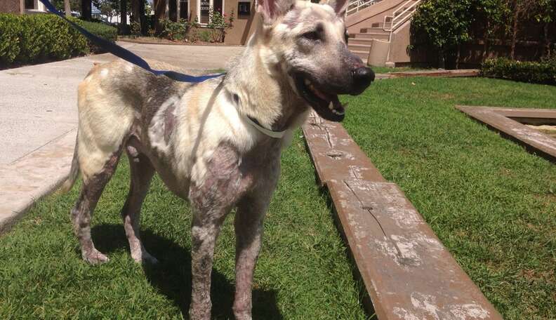 Weighing only 53 pounds, he was diagnosed with sever mange, bacterial infections, anemia, as well as a host of other issues.